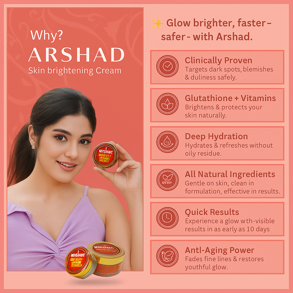Discover the secret to naturally glowing and flawless skin with Arshad Beauty Cream. Specially formulated with skin-friendly ingredients, this cream helps reduce dullness, lighten dark spots, and improve overall skin tone. Its nourishing blend deeply hydrates your skin, leaving it soft, smooth, and radiant all day long.